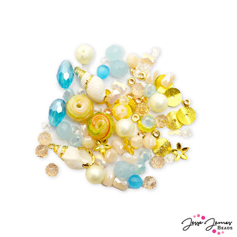 Sandy shores and crystal blue water. Dive into the clear blue water in this beach-inspired snack sized bead mix. This seashore-inspired bead mix features shell charms, faceted glass, metal heishi spacers, custom metal, and more. Largest piece in mix measures 17mm x 10mm. Smallest piece in mix measure 4mm.