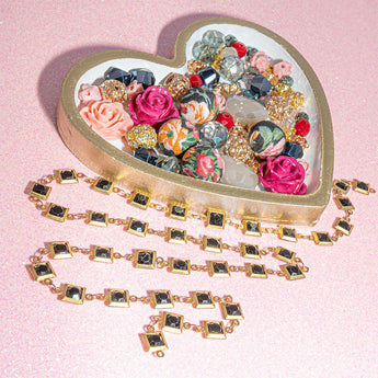 Dark Romantasy Bead Mix is a moody, romantic blend designed for statement jewelry with a dramatic edge. Featuring an 18" cut of art deco–inspired gold and black chain, a gold and white magnetic clasp, dark rose–patterned fabric pom poms, glass and gold metal spacers and bead caps, plus three sizes of hand-dyed acrylic roses, this mix is rich with gothic glamour and creative possibility. 80 pieces per mix. Beads measure in size from 3mm to 20mm.