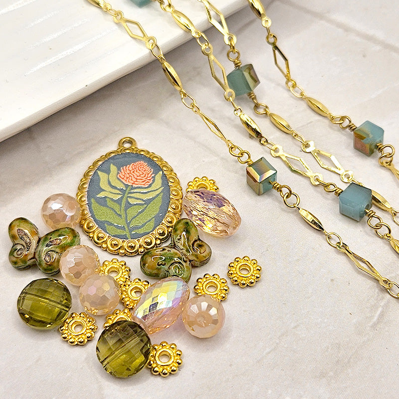 This beautiful pink and green bead bundle features a focal charm with a stunning Chrysanthemum design paired with faceted glass, pressed glass butterflies, and gold-plated metal. Each mix is accompanied by two legths of 24-inch beaded chain reaction chain for easy necklaces, bracelets, and more. Largest bead in mix measures 30mm x 22mm x 1.75mm. Smallest piece measures 4mm x 2mm.