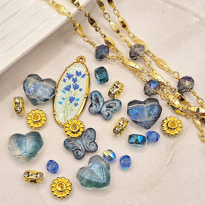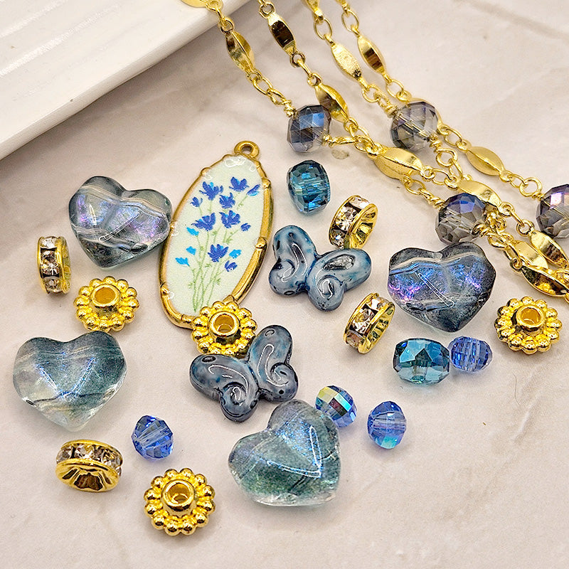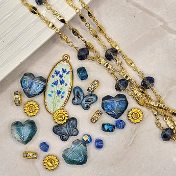 Fall in love with this stunning blue bead bundle. Each bundle includes a beautiful faceted glass bead mix featuring a blend of glass hearts, pressed glass butterflies, mini glass spacers, and gold-metal spacers. This bead mix is accompanied by two 24-inch lengths of stunning JJB chain reaction beaded chain. Perfect for easy jewelry creating or bulking up your bead stash. Largest bead in mix measures 14mm x 14m x 6mm. Smallest bead measures approx. 4mm x 2mm.
