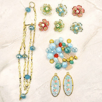 Dive into beautiful color with this stunning bead, chain, and charm set from Jesse James Beads. Each bundle features beautiful beaded floral charms paired with a mix of faceted glass and gold-plated metal beads, stunning metal and enamel flower charms, and a 24-inch precut length of Chain Reaction Chain. Perfect for beginners or stocking your bead stash!