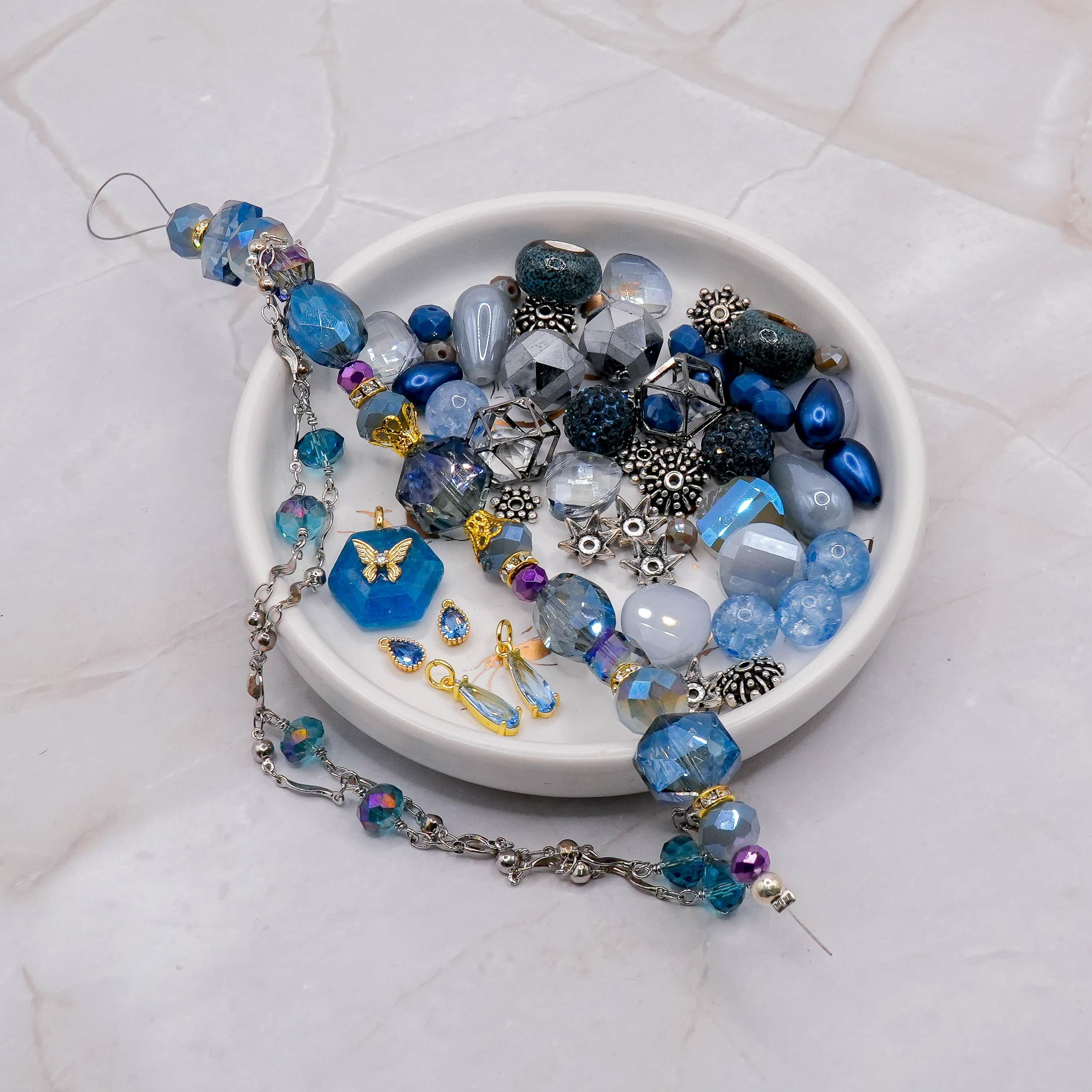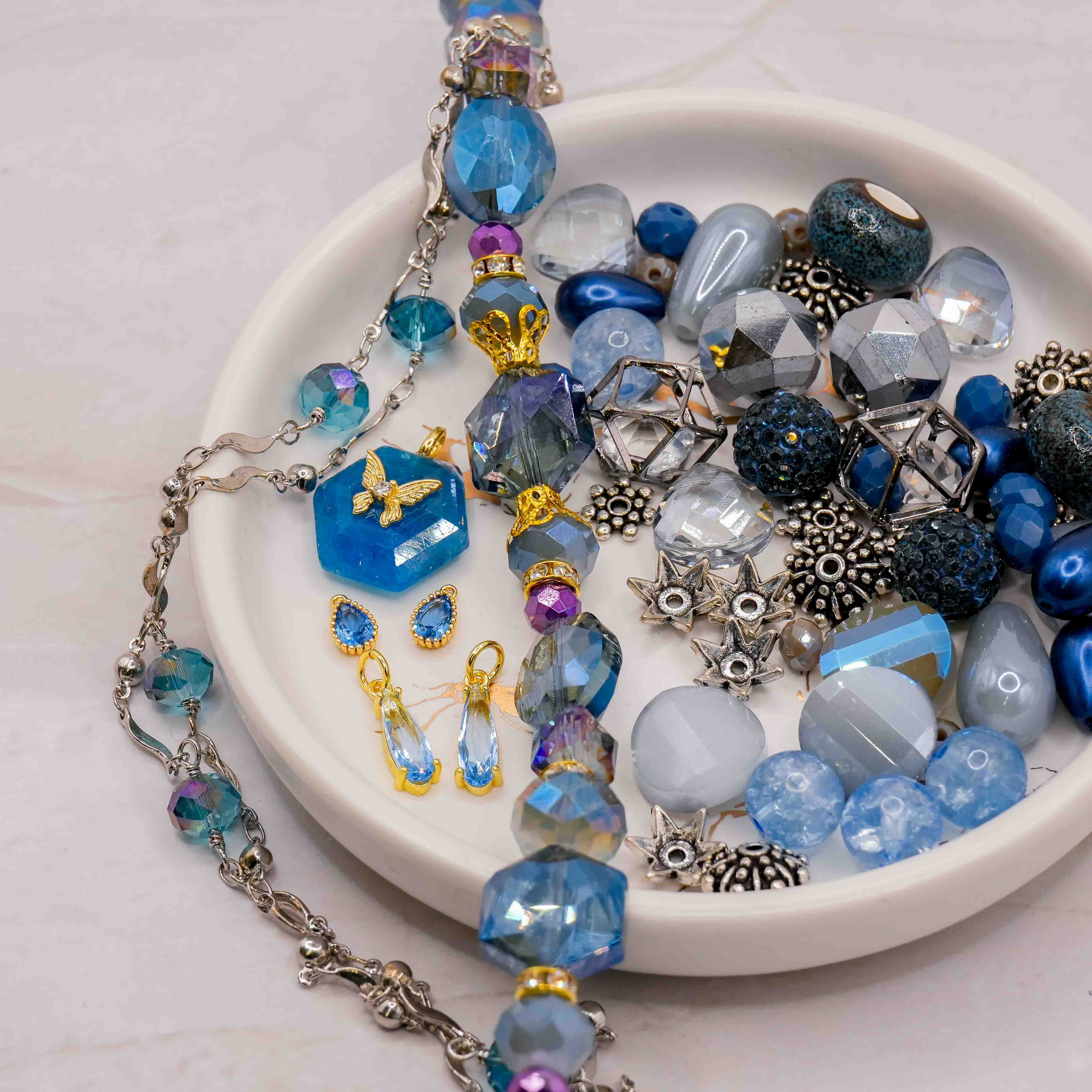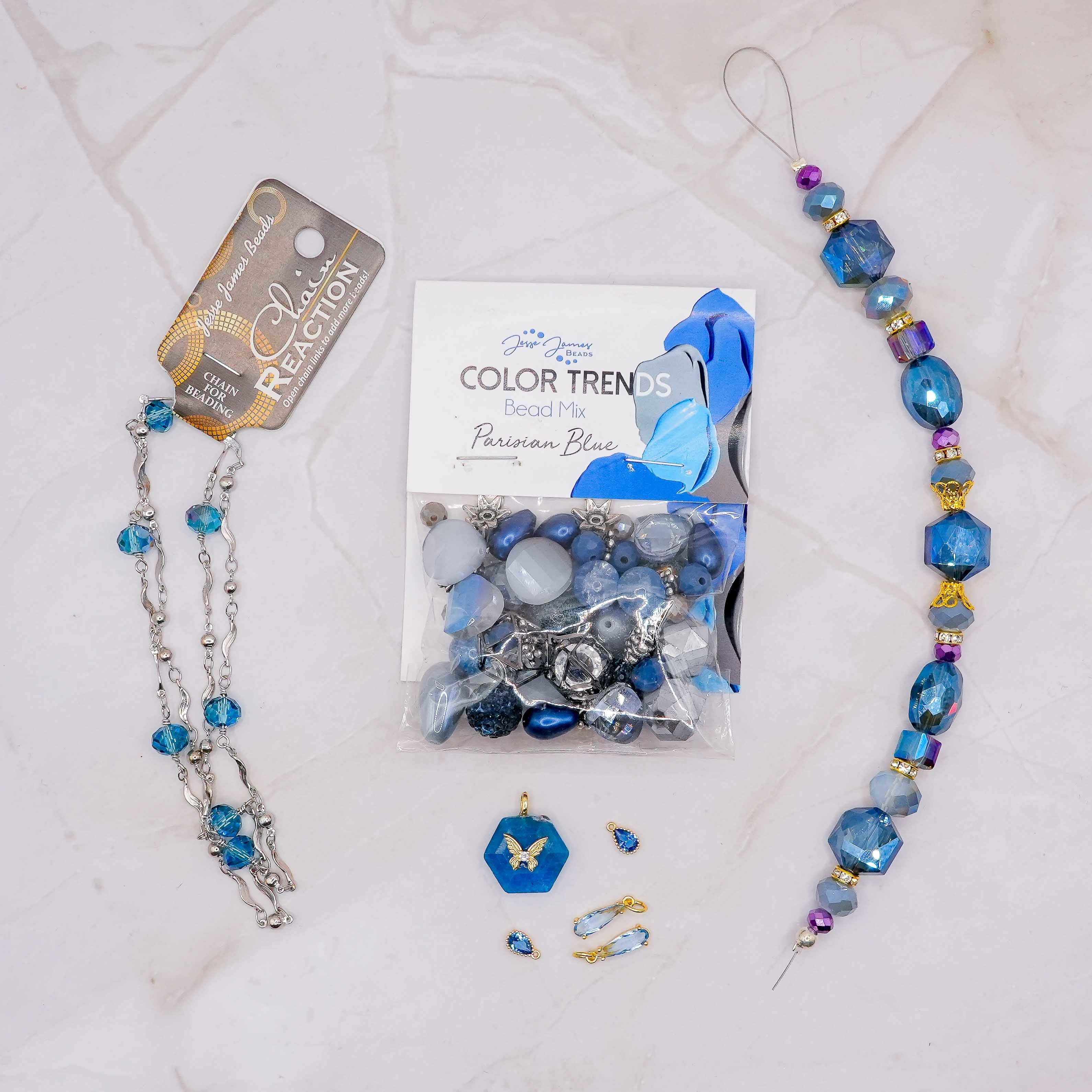 This beautiful blue bead bundle features a stunning aray of cool blue colors for jewelry making. Every bundle includes a charm set featuring a natural stone Apatite charm paired with faceted glass charms, pre-clasped chain reaction chain, a Parisian Blue Color Trends Bead Mix, and a 7-inch glass bead strand.