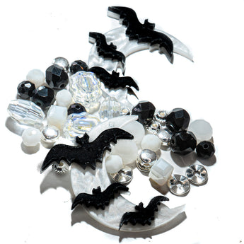 This feeling batty bead mix features adorable acrylic crescent moon and bat charms paired with stunning moonlight white faceted glass coins, faceted glass cubes, mini rondelles, black faceted glass rondelles, black faceted glass mini rondelles, and crystal pressed glass. Largest piece in mix measures 35mm x34mm x 4mm. Smallest piece measures 4mm x 2mm.