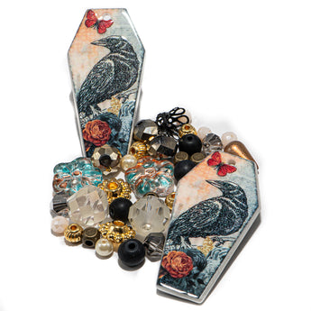 This adorable crow-inspired bead mix features a pair of large printed acrylic crow pendants paired with pressed glass flowers, faceted galaxy rondelles, mini glass pearls, mini glass rondelles, faceted glass rondelles, mini acrylic teardrops, and gold-plated metal spacer beads. Largest piece in mix measures 41mm x 21mm x 2mm. Smallest piece in mix measures 4mm.