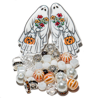 This adorable bead mix features a pair of adorable ghost acrylic pendants paired with ghostly white glass rondelles, glass pearls, crystal glass bicones, orange and white striped beads, silver-plated metal round beads, and silver-plated metal bead spacers. Largest piece measures 36mm x 21mm x 1.5mm. Smallest piece measures approx. 4mm.