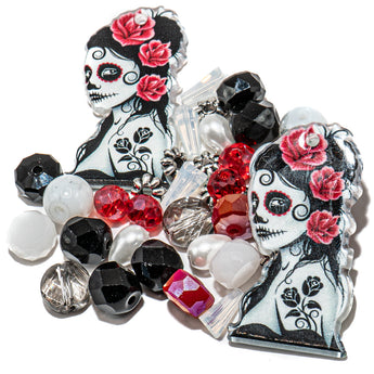 This stunning Dia De Los Muertos themed bead mix features a pair of beautiful Las Muertas acrylic charms paired with lovely red faceted glass, ghostly grey round glass, pearlized teardrops, black faceted glass, and silver-plated bead spacers. Largest piece in mix measures 35mm x 18mm x 2mm. Smallest bead measures 4mm x 2mm.