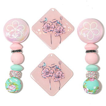 This chunky bead mix features large flower-painted focal pendants paired with round printed silicone beads, large-hole rhinestone beads, silicone heishi, and printed acrylic.
