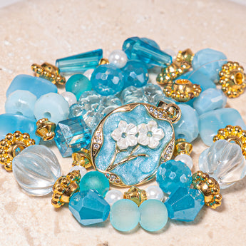 This sky blue bead mix features an adorable focal wildflower pendant accompanied by faceted glass beads, mini glass pearls, and gold-plated metal spacers.