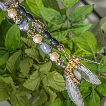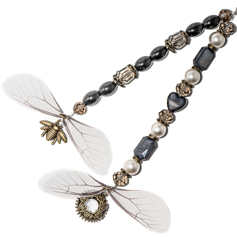 This dark and romantic duo of dark grey and black glass beads features glass pearls, glass ovals, faceted glass rondelles, glass hearts, antique gold plated alloy metal spacers, and adorable charm dangles. This duo of 5-inch strands is a must have for daring and romantic jewelry pieces. Largest bead in the set measures 11mm x 10mm. Smallest bead measures 6mm x 2mm. Wing charms measures approx 36mm x 20mm x 0.5mm and are made of a lightweight chiffon, perfect for earrings!