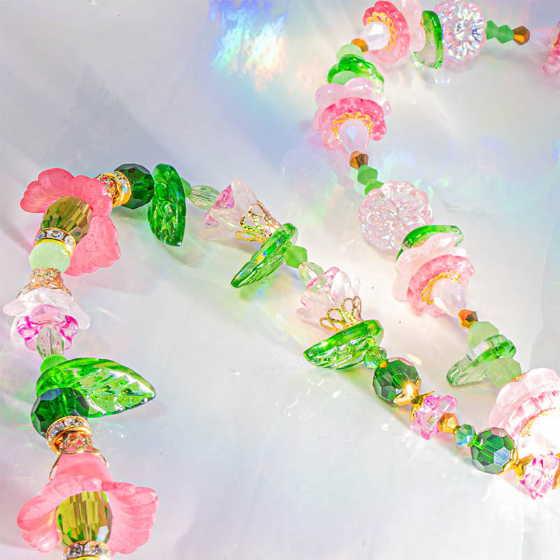 This playful duo of 7-inch strung beads features a custom-dyed blend of pink acrylic flower beads paired with pressed glass, faceted glass, faceted glass teardrops, faceted glass bicones, mini glass rondelles, gold-plated bead caps, gold-plated bead spacers, glass leaf beads, and more. With 14-inches of beads to choose from, this set easily transforms into earrings, bracelets, and necklaces. Each set includes over 100 beads to create with. Largest bead in set measures 18mm x 20mm. Smallest bead measures 4mm.