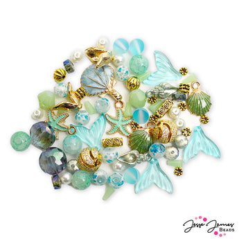 Make a Splash with this classic Summertime favorite. This bead blend features glass mermaid tails, enamel charms, faceted glass, gold metal beads, and more. Largest bead in mix measures 26mm x 20mm x 3.7mm. Smallest bead in mix measures 6mm x 2mm.