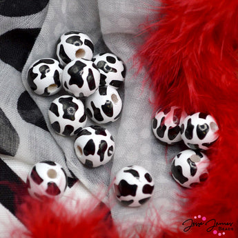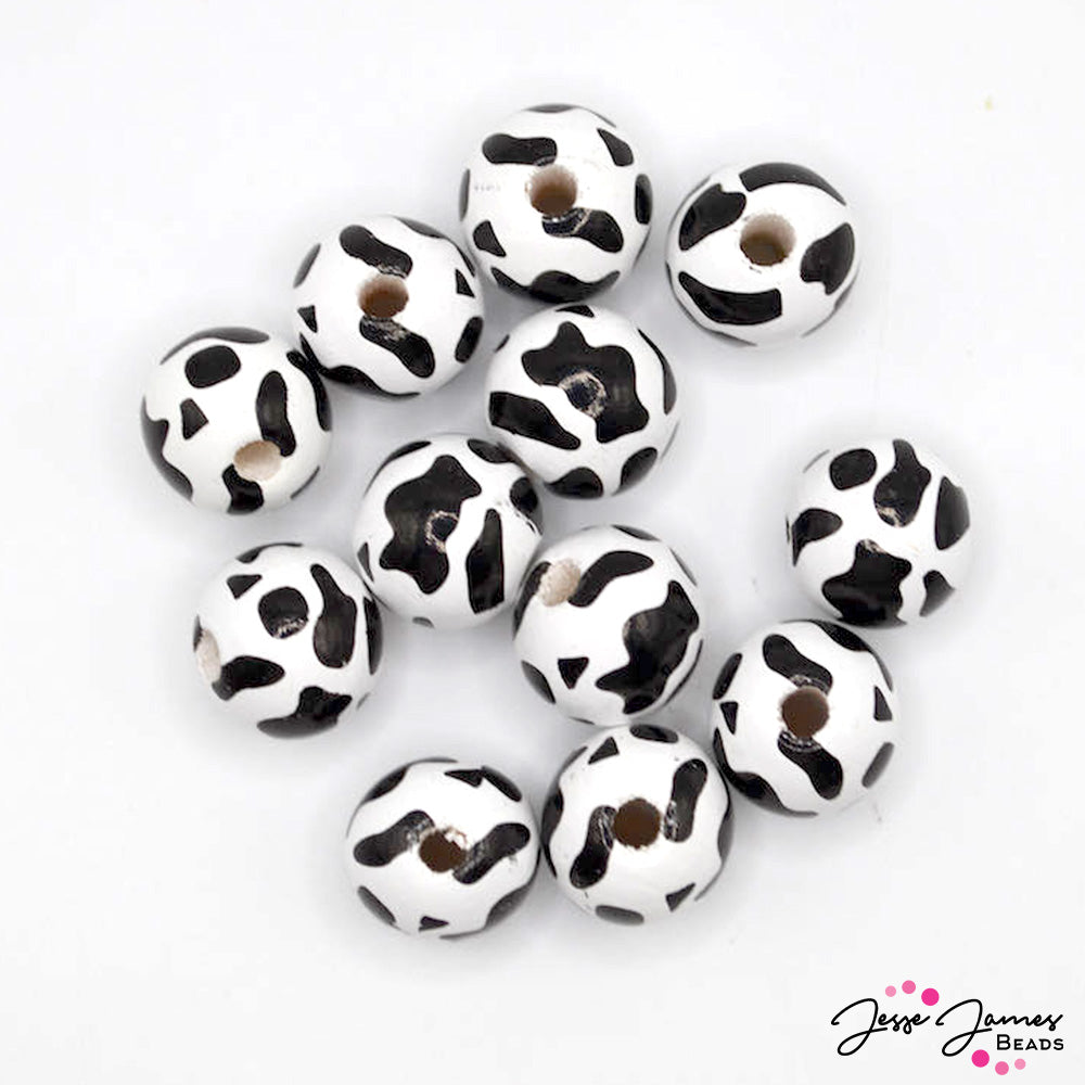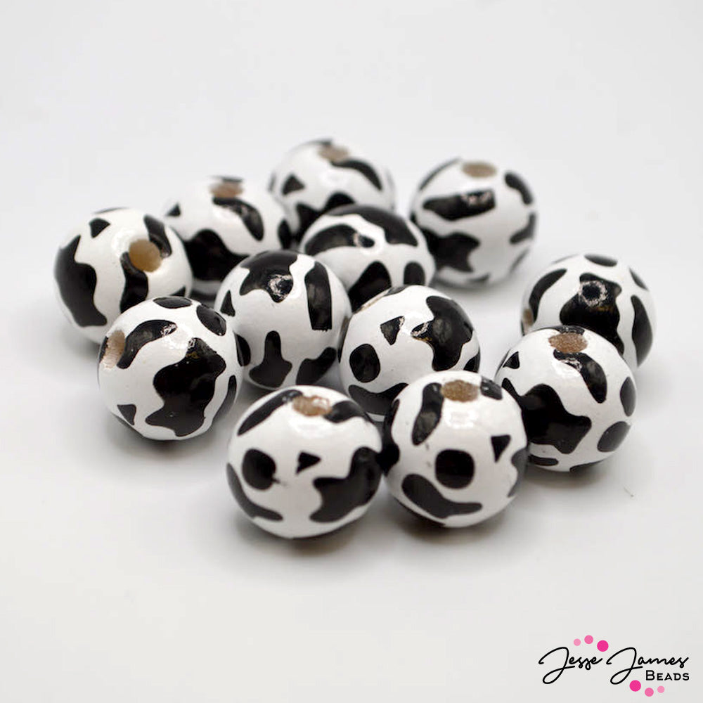 Create a stand-out piece of jewelry with these adorable yet daring cow-print wood beads. Each bead measures 16.5 mm round. Sold in sets of 12.