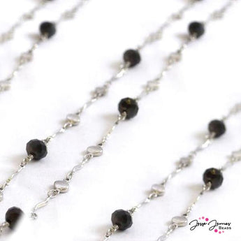 Silver colored 18in chain features beautiful black faceted glass rondelle beads. The unique design of the black beaded chain makes this a truly special element to incorporate into your jewelry design.