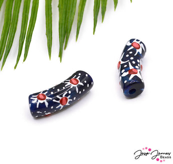 These beautiful resin focal beads feature organic flower patterns in white and red. Sold in pairs. Each bead measures 12mm x 34mm.