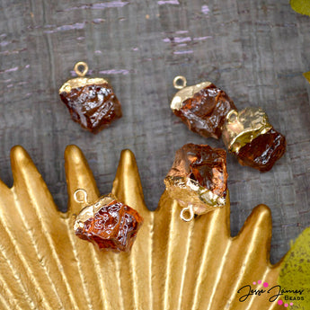 These beautiful resin charms feature a rich amber color topped with sparkling bright gold-plated metal. These amber charms feature one rough geode-textured side and one flater smooth side, ideal for helping these charms sit as a focal of a necklace or bracelet. Each charm measures 22mm x 14mm. Inner Bail size: 2mm. 4 pieces per set.