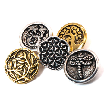 This stunning assortment of metal buttons features organic nature inspired patterns. Perfect for focals or end findings, these buttons offer a versitile design element in your next jewelry creation.