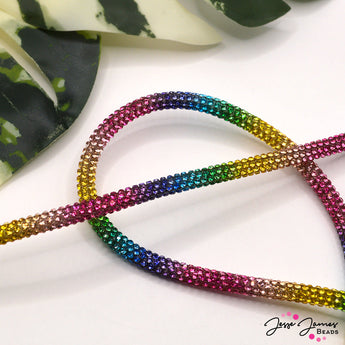 Add vibrant color and texture to your jewelry creations with this gem-covered cord in a stunning rainbow array. Perfect for gluing into clasps, it allows you to craft layered bracelets or necklaces that sparkle with every movement. The colorful gems create a dynamic and eye-catching effect, ideal for adding a bold statement to any design. Sold in 1 Meter Cuts. Clasps Sold Separately. Cord measures 6mm thick.