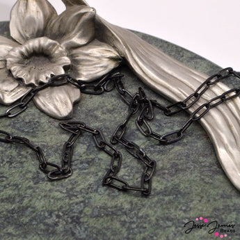 This stunning solid black stainless steel chain adds a pop of elegant color to any design project. Each link measures approx. 9.7x4.2x0.9mm. Sold in 1 meter lengths.