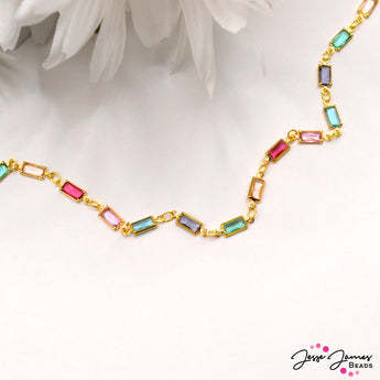 Add a dynamic, modern touch to your jewelry designs with the 18K Gold Dangle Chain in Electric Slide. Perfect for jewelry designers looking to create pieces with movement and sophistication, this 18-inch chain features a stunning combination of handmade brass links and glass beads that sparkle with every step.