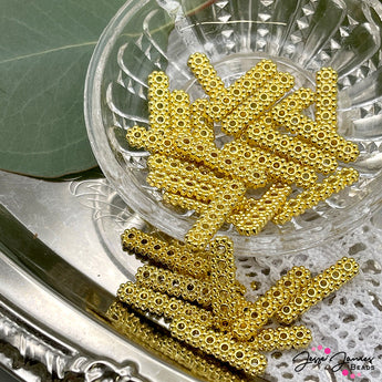Allow the strands of your jewelry to meet in perfect marriage with these multi-strand spacer beads. These bright gold-plated metal components are ideal for multi-strand bracelets, necklaces, and beyond. Pair with your favorite sparkling bohos, faceted glass, and more for dazzling jewelry creations. Measures 20mm X 4mm. 4 beads per set