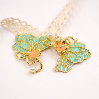 This pair of butterfly wing-shaped connectors features a vibrant blend of green and orange hues, accented with gold metal and a delicate glass pearl accent. Their nature-inspired design adds a whimsical and elegant touch to earrings, bracelets, or necklace creations. Measures 35mm is size. Sold as a Pair. Lead-free, nickel-free and cadmium-free metal with colored glass enameling.
