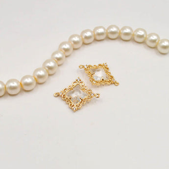 These diamond-shaped brass filigree connectors feature shimmering glass crystals set in ornate gold frames, catching the light with every movement. Their intricate swirl detailing adds a touch of vintage glamour, making them perfect for elevating earrings, bracelets, or necklaces with effortless elegance. 29mmn X 23mm. Sold as a pair. lead-free, nickel-free and cadmium-free plated metal with glass and rhinestone accents.