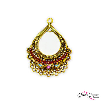 Amaterasu is the Japanese Goddess of the sun and is revered as the goddess of light, prosperity, and harmony. This beautiful sunshine gold pendant features a touch of colorful enamel, perfect for adding a touch of light to any necklace or jewelry design. This connector pendant also features several loops to add tassels, dangles, beads, and more. Each pendant measures approx. 43.8mm x 32.9mm x 3mm.