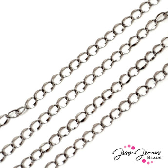 36 inches of stunning true gun metal plated chain. This chain features slightly twisted hoop links. Chain is 3.5 mm thick and is nickel and lead free.
