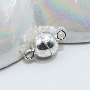Secure your designs with style using the Sterling Silver Plated Round Magnetic Clasp. Made from durable brass and plated with 925 sterling silver using high-quality rack plating, this 11.5x6mm clasp features a sleek round shape and built-in loops for easy attachment. Inside, a powerful N45 grade magnet provides a strong and reliable hold, making it ideal for both lightweight and heavier jewelry pieces. The 1.6mm hole accommodates a variety of stringing materials, offering versatility for bracelets, necklaces, and more. Elegant, practical, and long-lasting, this clasp is the perfect finishing detail for polished, professional-looking designs.