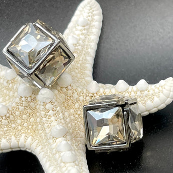 These sparkling focal beads feature a large AB Rhinestone center adorned by silver plated metal frames. These cube shaped beads sparkling when exposed to light, these focal crystals sparkle in shades of blue, purple, yellow, and green. Sold in a set of 2 beads. Measure 16mm.
