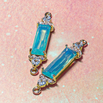 Add a cosmic look to your next jewelry creation with these stunning long focal connectors. Each connector features a stunning stardust-inspired glass center surrounded by brass metal. Each connector measures approximately 30mm x 8mm.