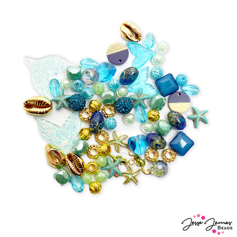 Explore the depths of the Mermaids Grotto with this blend of teal and rich gold. Each meta mix includes mermaid tail charms, gold metal shell beads, mini starfish, faceted glass, gold metal spacers, and more. Largest bead in mix measures 36mm x 30mm x 1mm. Smallest bead in mix measures 8mm.
