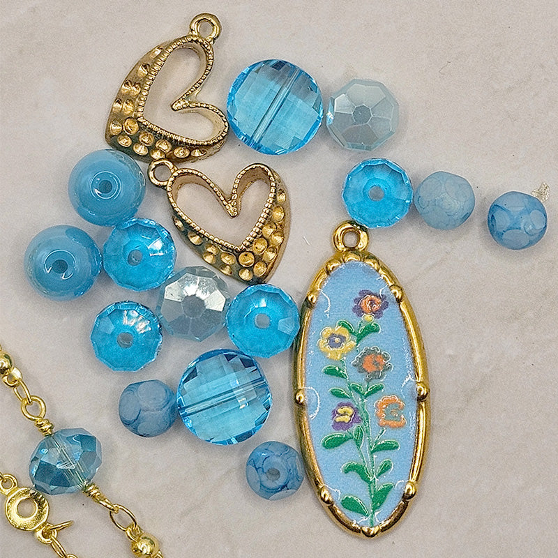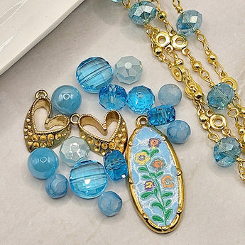 This fresh teal bead bundle features a beatiful glass bead mix featuring faceted glass rondelles, faceted glass coins, glass rounds, gold-plated metal rhinestone heart charms, and gold-plated enamel floral charm all in a stunning bright aqua color! Each mix is accompanied by two 24-inch lengths of JJB chain reaction beaded chain for easy necklace or bracelet creating. Largest piece in mix measures 34mm x 15mm x 2mm. Smallest piece measures approx 6mm.