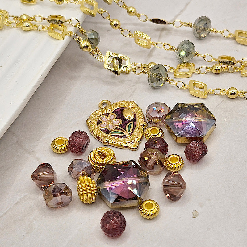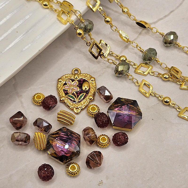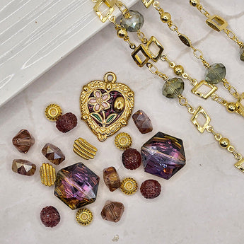 This stunning bead bundle features a vibrant blend of plum purple and sage green colors. Each bundle includes a glass bead mix featuring faceted AB finished glass focal beads, glass bicones, glass spacers, ad gold-plated metal beads. Each mix includes a beautiful gold-plated metal and enamel flower pendant perfect for adding flair to any jewelry project. Two 24-inch cuts of JJB signature chain reaction chain finish off this stunning bead bundle. Perfect for creating quick and beautiful necklaces, earrings, and more. Largest piece in mix measures 24mm x 18mm x 2.5mm. Smallest bead in mix measures 4mm x 2mm.
