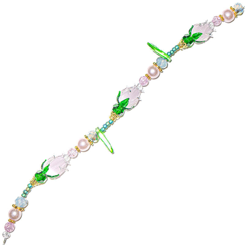 Bead strand in Pink Tulips pairs delicate flowers and green leaves for a fresh, springtime-time inspired look. Each 7-inch strand is comprised of three whisper pink tulips, accented by green leaves, pink and white beads and gold accent separators and end caps. 35 pieces. Beads range in size from 2 mm to 13 mm.