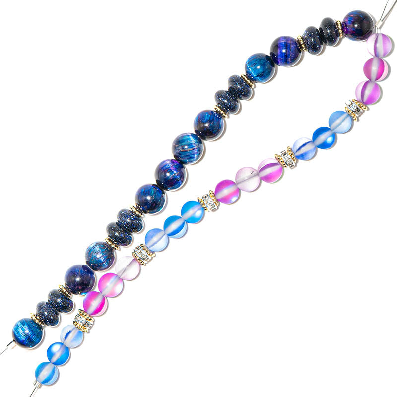 Stone Bead Strand Duo in Adventure Through Andromeda takes you through the galaxy in shades of blue and purple. Each 5-inch strand is a deep mix of Goldstone and Rainbow Tiger's eye beads. 41 pieces. Round stones range in size from 5 mm to 8 mm.