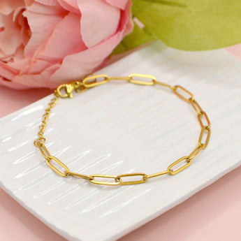 Chic and contemporary, this 304 Stainless Steel Paperclip Chain Link Bracelet is a stylish must-have for women who love modern jewelry. Featuring sleek paperclip-style links, this bracelet is crafted from high-quality stainless steel and finished with a layer of real 18K gold plating for a radiant, lasting shine. The design is lightweight yet durable, making it perfect for everyday wear or layering with other pieces for a trendy stacked look. Measuring 6-5/8 inches (16.9 cm) with a 65mm extender, it offers an adjustable fit for added comfort and versatility. A perfect blend of elegance and edge, this bracelet is a timeless addition to any collection.