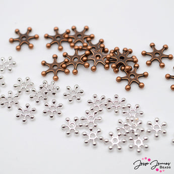 These classic JJB star style spacers make great additions to bracelets, necklaces, and more. Available in Copper and bright silver colors. Copper color measures 12mm x 2mm and is available in a set of 12 pieces. Silver color measures 7mm x 2mm and comes in a set of 30 pieces.