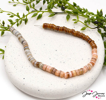 This beautiful ombre of beads features light peachy tans paired with cooler browns. Each heishi measures 6mm x 2mm in size. Each strand features approx. 60 heishi beads to work with.