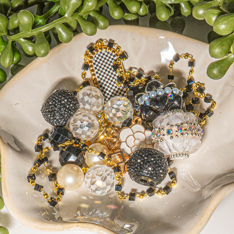 Add an elegant touch to your next jewelry project with this stunning blend of black and white beads. Each mix features a blend of boho beads, faceted glass, rhinestone spacers, glass pearls, brass metal enamel charms, and gold cage crystal beads. Largest bead measures 20mm. Smallest bead measures 4mm x 2mm. Approx 14 focal beads per mix plus spacers. Each mix also includes 18-inches of brass gold-plated brass chain with faceted glass square links. Chain measures 2.5mm thick.