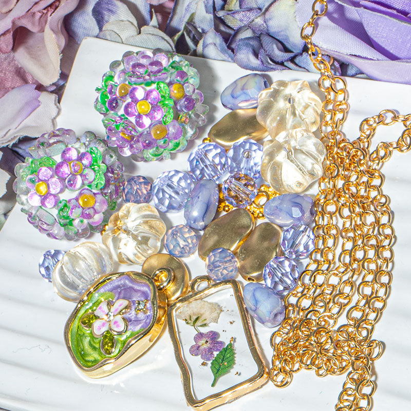 This playful purple bundle of beads features a pair of clay boho beads with purple flower resin embellishments paired with a mini bead mix and 24-inch cut of stunning 18K gold-plated metal rolo chain. Each bead mix includes a blend of faceted glass beads and gold plated brass metal spacers. Each set also includes a pressed flower focal charm. Largest piece in set measures 20mm. Smallest piece in set measures 6mm.