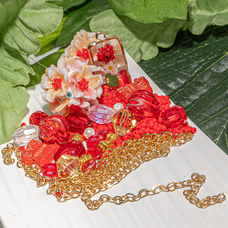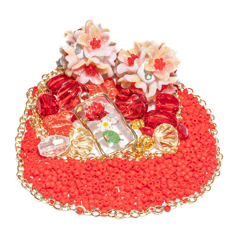 Ready to add a little fire to your jewelry creations? These bead bundle features a stunning duo of clay boho beads adorned with resin floral embellishments and sparkling AB rhinestones. These focal beads are paired with a mix of glass beads, gold-plated brass metal spacers, red 11/0 seed beads, and a 24-inch cut of 18K gold metal rolo chain. Largest piece in set measures 24mm. Smallest piece measures 2mm.