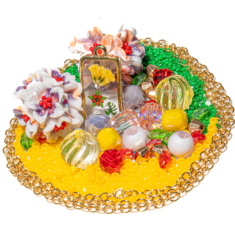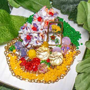 This wild bundle of floral beads features a duo of clay boho beads adorned with stunning purple and orange resin flowers and sparkling rhinestones. These show-stopping beads are paired with a mix of glass beads, two styles of 11/0 seed beads, and a 24-inch cut of 18K gold-plated metal rolo chain. Dive into a sea of color with these bright purple, yellow, red, and green hues. Each mix includes faceted glass rondelles, faceted glass barrel beads, faceted glass bicones, frosted glass rounds, and twisted glass beads. Largest bead measures 24mm. Smallest bead measures 2mm.