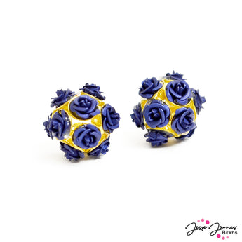 These royal blue beads are accented with bright gold metal. Each bead features delicately detailed cobalt roses wrapping around a gold metal base. 2 beads per set. Each bead measures 15 mm.