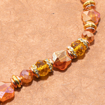Add classic pumpkin flavor to your next beaded creation with this 7-inch glass bead strand. Each strand features faceted glass flower beads, faceted glass rondelle beads, faceted glass teardrop, bright gold-plated metal heish beads, and bright gold-plated metal and rhinestone spacers. Largest bead on strand measures 12mm x 14mm x 7.5mm. Smallest bead on strand measures approx. 4mm x 2mm.