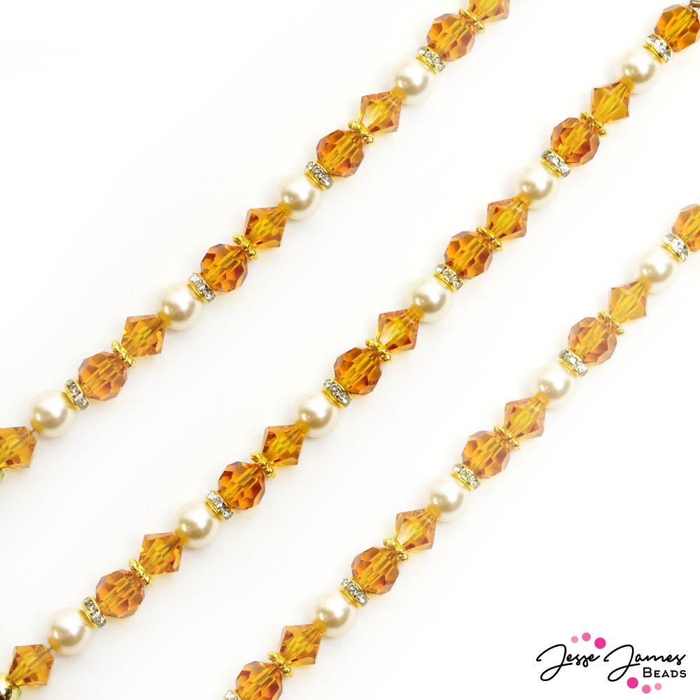 Bright, playful, and a little sweet. This Preciosa bead strand features a blend of bright orange with a touch of creamy white. Each 5 inch bead strand is packed with Preciosa Crystals paired with Jesse James Beads metals. Most beads on strand measure 6mm.