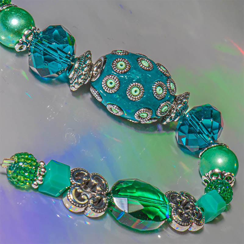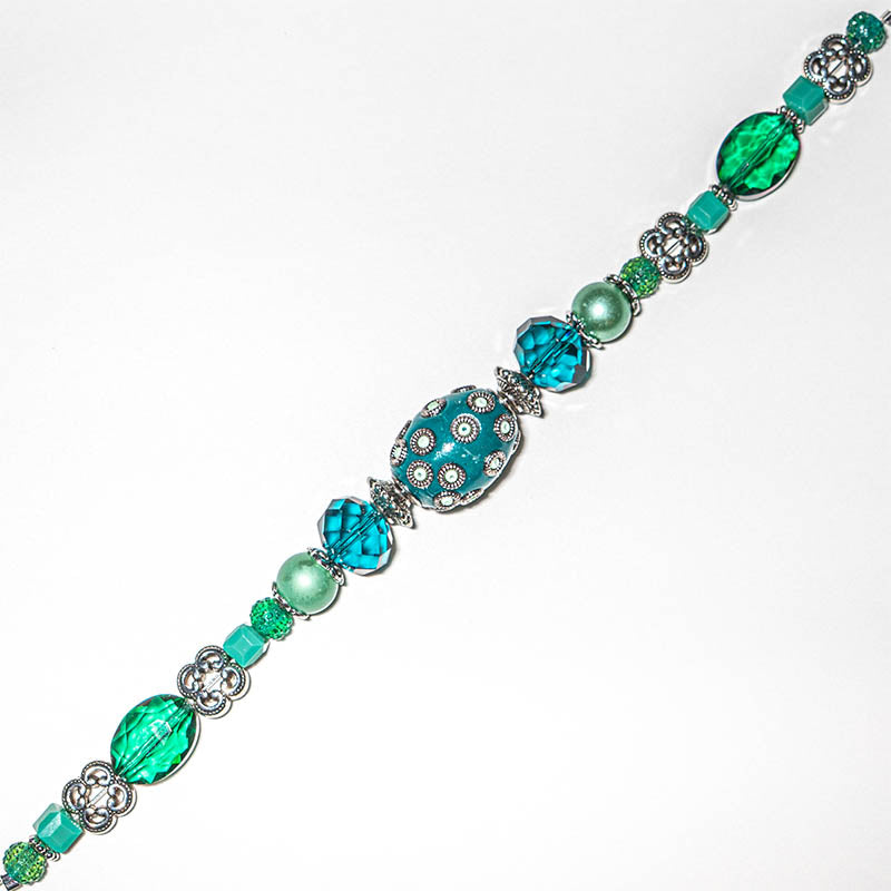 Boho Bead Strand in Mystic Mystery is a delightful collection of greens, perfect for spring and Celtic-inspired jewelry creations. Each 7-inch strand contains one large focal bead, complemented by beads in many shades of green with beautiful silver accents. 23 pieces. Beads range in size from 2 mm to 21 mm.