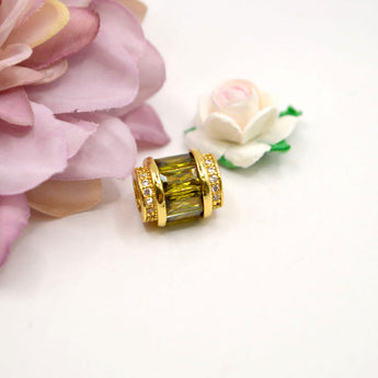 Dive into sophisticated olivine green with this stunning focal bead. Featuring a sophisticated column shape and stunning micro-pave cubic zirconia detailing, this focal bead is designed to bring both elegance and shine to your creations. The golden finish is achieved through high-quality plating, ensuring durability and a long-lasting shine. With a large 4.5mm hole, these beads are perfect for threading onto bracelets, necklaces, or other European-style charm bracelets. Nickel-free and made from brass. Beads are sold individually. Each bead measures 11mm x 9mm.