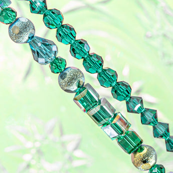 This duo of 6-inch bead strands is a must-have for creating rich green beaded jewelry and crafts. Each set features one strand with 6mm Preciosa faceted ball glass beads and 6mm Preciosa faceted glass bicone beads. This Preciosa bead strand is accompanied by a strand with accenting faceted glass rondelles, faceted glass bicones, faceted glass square beads, and window cut glass rounds. Largest bead in the set measures 10mm x 8mm. Smallest bead in the set measures 6mm x 4mm.
