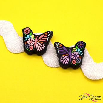 These beautiful butterfly silicone beads feature multi-colored flowers and are available in two colors. Choose between purple passion or posh pink for both to make stunning friendship bracelets, earrings, and more. Each butterfly measures 30mm x 28mm.
